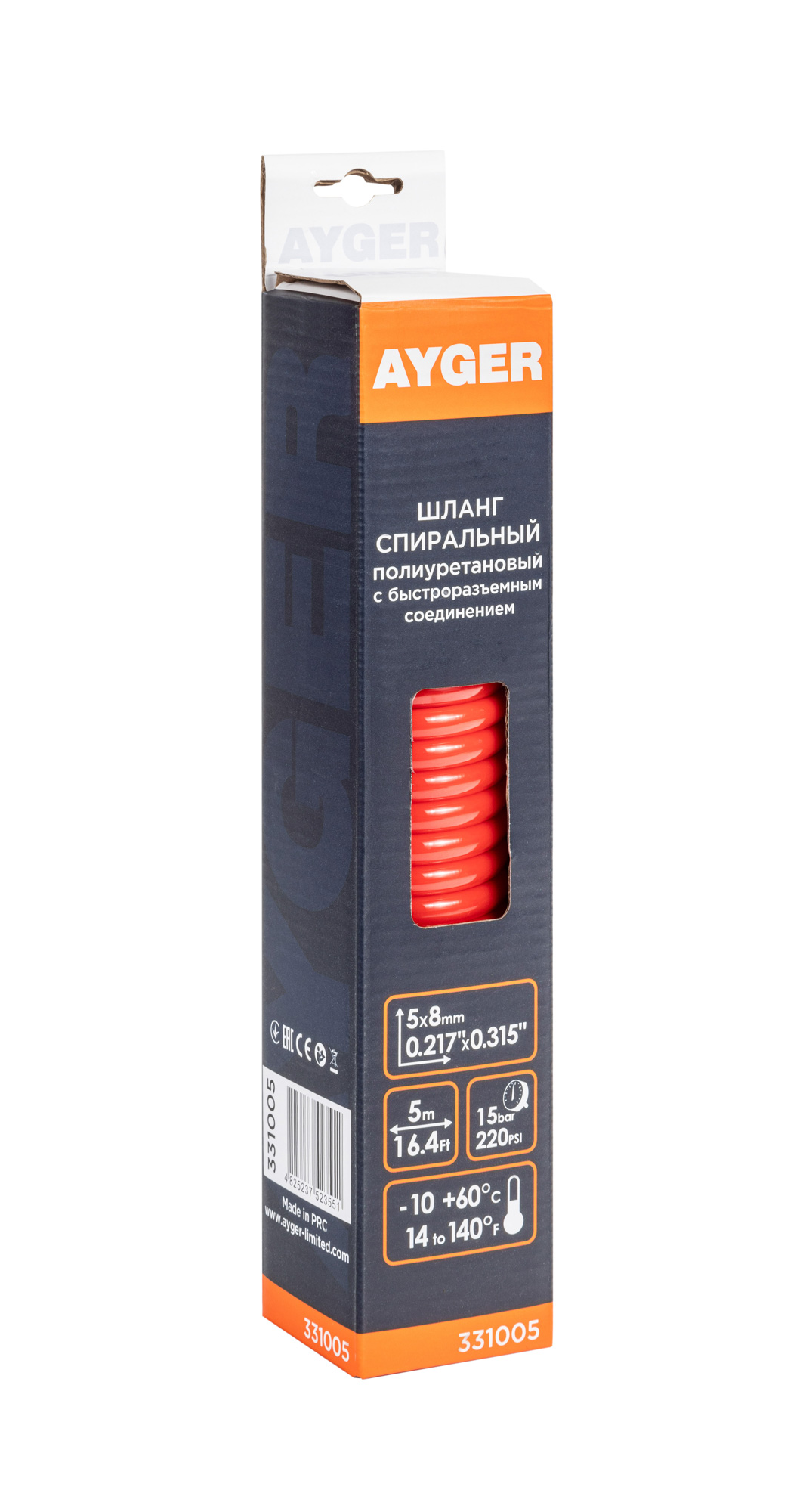 AYGER Шланг 5M 5*8mm спиральный полиуретановый с быстроразъемным соединением, гибкий однослойный